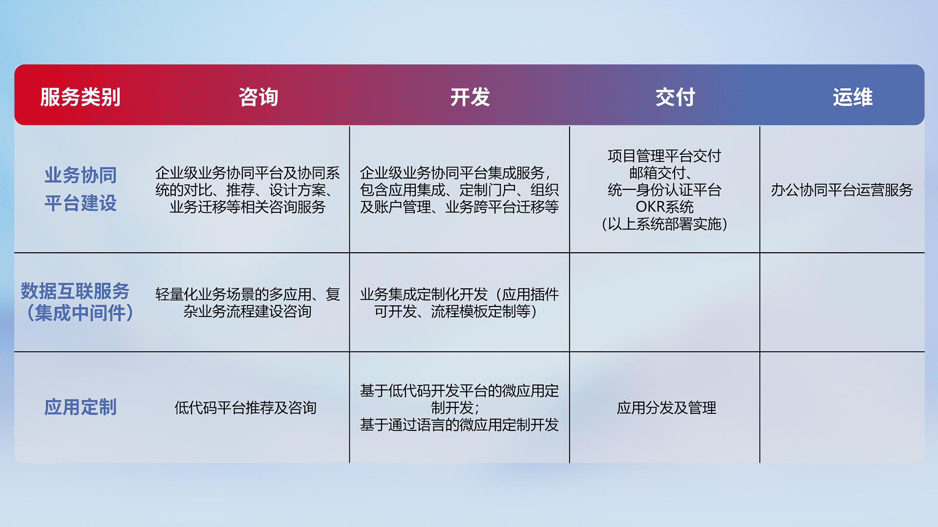 针对钉钉、、企微、、、、IDaas等平台级产品提供产品的规划、、、方案、、、、交付、、、、定制化开发等服务,,,实现如统一协同办公、、、、智能客户服务、、、混合会议管理、、智能数据查询、、、等业务场景,,实现数字化转型。。。。